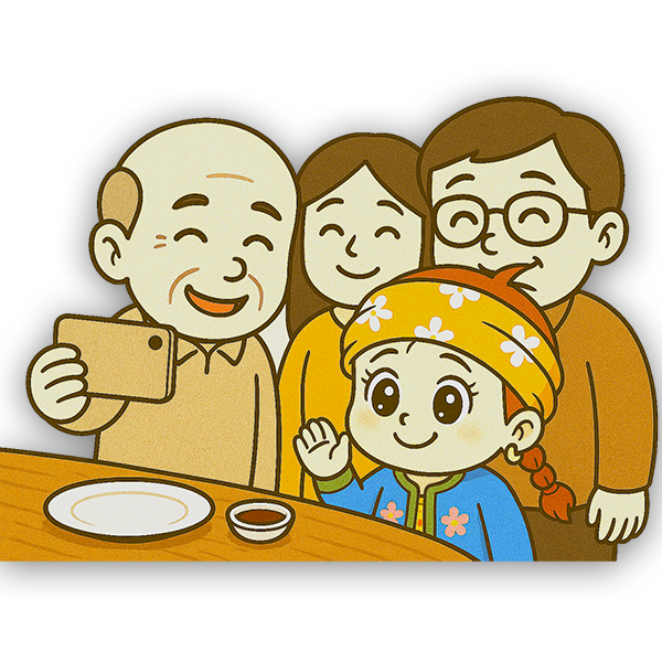餐席間,親戚們皆以勤力能幹的阿義為榮,拉著阿義搶著拍照,拍照前還要講:「阿義,___!」